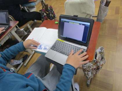 国語科「初雪のふる日」では、「初雪のふる日」とはどんな印象のお話かを考えました。言葉や表現に着目し、どこからその印象を感じたのかを説明する文章をロイロノートに書きました。