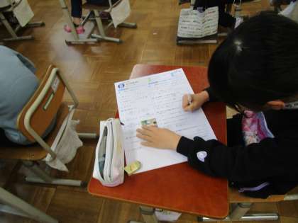 国語科では「たしかめよう」のテストに挑戦。初めて読む文章なので、何度もしっかりと読み返していました。