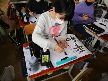 書写ではまとめの学習として「平和」の文字に挑戦。姿勢を整え、今までに習ってきたことをいかして書いていきました。