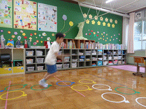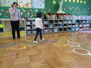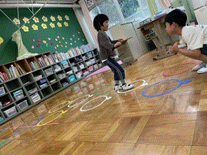 ケン・ケン・パをみんなでしました。リズムよく「ケン・ケン・パ♪」と、たのしそうにとんでいました。慣れてくると赤色は踏まないようにとリングの色によっては使わないようにするなど発展して体を動かしていました。