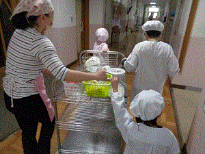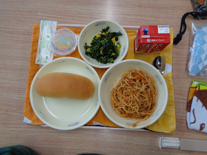 今日から今年度の給食が始まりました。1年生にとっては小学校で食べる初めての給食です。初めての給食は子どもたちにも大人気の「スパゲッティのミートソース煮」でした。デザートには、りんごゼリーもついていました。みんなでおいしく食べました。