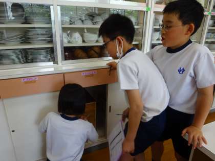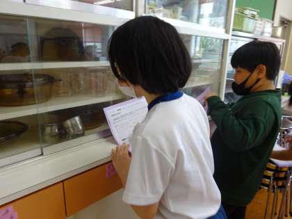 また、これから実習で使う家庭科室の探検をして、どこにどんなものがあるのかを見つけました。家庭科の学習を通して、家族の一員としてできることを増やしていってほしいです。