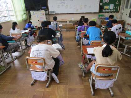 外国語活動で使う単語カードをはさみで切る子どもたち。たくさんの枚数がありましたが、集中して切ることができていました。