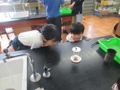 底のない瓶を使って、上や下に隙間を作ってろうそくの火の燃え方を調べました。