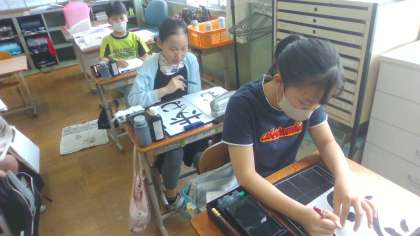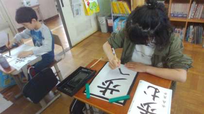 初めにお手本を見ないでためし書き、その後お手本と見比べ、どのようなところに気を付けて書くかという自分のめあてを決めて書きます。「歩の字が大きくなりすぎたので、文字の大きさに気を付けたいな。」「むの字の結ぶところの筆遣いが難しいので、練習したいな。」「漢字は大きめ、ひらがなは少し小さめにして書きたいな。」などと、みんなで共有してから書き始めました。