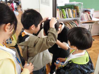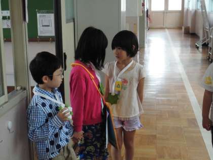 1年生の教室に2年生の案内係が迎えに行き、プレセントのメダルを首にかけてあげました。