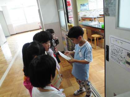 教室の紹介係の子どもたちは、繰り返し練習した説明を堂々と1年生に伝えていました。