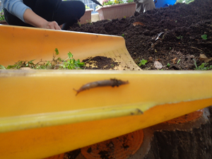 畑をきれいにしている時に花壇にふと目をやると、小さなあおむしさんを発見しました。さらに活動しているとナメクジさんも発見しました。