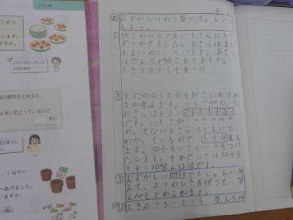 3年生では、算数科「わり算」を続けています」問題もどんどん難しくなり、今は答えが10を超えるわり算や、たし算やひき算も加わった文章題に取り組んでいます。来週にテスト予定です。おうちでも復習よろしくお願いいたします!