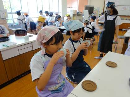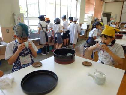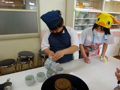 水や茶葉の量を量って、安全に気を付けて湯を沸かしたり、お茶を入れたりしました。同じ量や濃さになるように気を付けながらお茶を入れるのが難しかったようですが、みんなで協力することができました。後片付けもテキパキとできる5年生です。