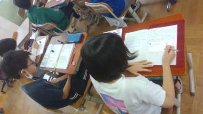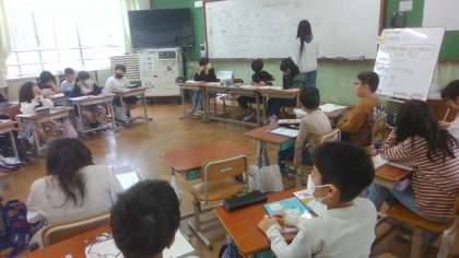 L字型などの複合立体図形について、直方体の体積の公式を使って、工夫して求めました。立体を二つに分けたり、つぎたしたりして考えれば、直方体や立方体の体積の公式を使って求めることができることに気づき、求め方を全体で交流しました。