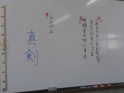 3年生が始まって1か月がたちました。学年で集まり、これからどんな3年生になっていきたいかを話し合いました。それぞれが大切な言葉を出し合い、学年目標を決定しました。「真剣に時間を守って次に生かす」を合言葉に、頑張っていきたいと思います!
