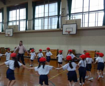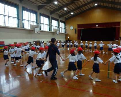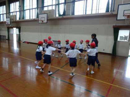 体育科の学習で「フォークダンス」をしました。はじめはグループごとの小さい円でしましたが、最後には1年生みんなで大きな円で踊りました。手をつないで動くところは、手が離れないようにともだちに合わせて動くことができました。