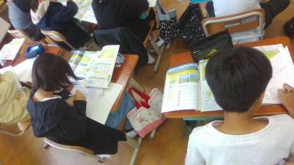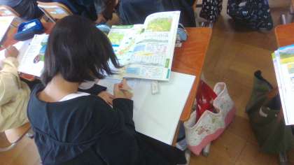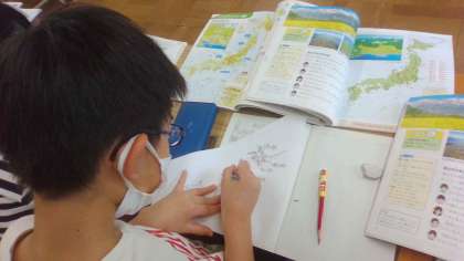「川の上流は山地で、下流になると平野を流れている」「日本で1番大きな湖は琵琶湖」など調べたことをまとめていました。