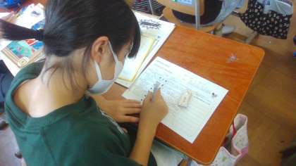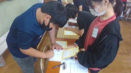 相手に伝えるときは相手の目を見て、はきはきとした発音で伝えることができました。たくさんの人と交流することで、授業の振り返りのときには「最初は名前のつづりの訪ね方を知らなかったのに、あっという間に、自己紹介をしあうことができた。」と書いている姿も見られました。