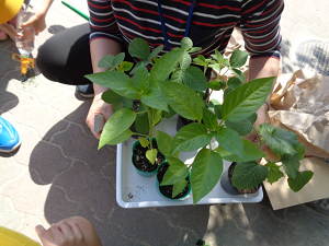 現在、うぐいすの畑では、じゃがいもの栽培を行っていますが、今日はピーマンと枝豆、さつまいも、オクラの苗を植えました。