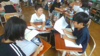そして、本時では役割を交代しながらインタビューをし合いました。それぞれの役割での「きき方」を意識しながら、インタビューをしました。また、記録したメモを基に、インタビューの報告をすることができました。