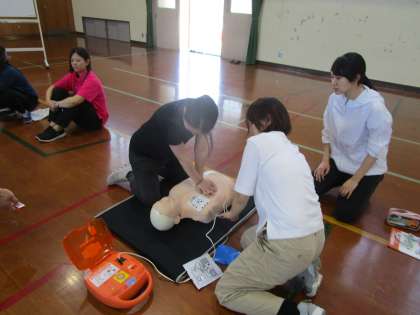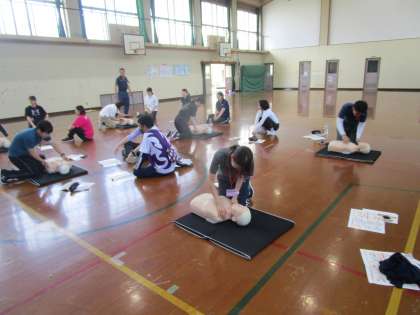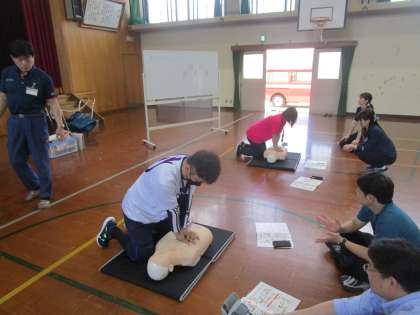 6月4日(火)の午後より、下京消防署の指導の下、教職員の普通救命講習を行いました。心肺停止になった人がいた場合、どのように行動すべきか、実際の場面を想定して訓練しました。