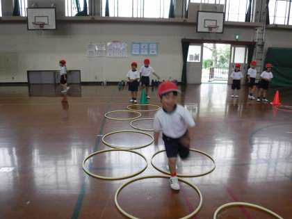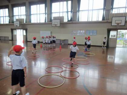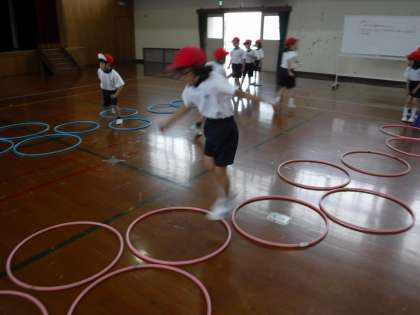 体育科で「とびあそび」の学習をしています。この日は「調子よくとぶ」ことをめあてに、フープをリズムよく跳びました。より遠くへとぶ、高くとぶなどのいろんな跳び方もこれから学習していきます。「楽しい!」「もっといろんなコースを跳んでみたい!」とやる気いっぱいな1年生でした。