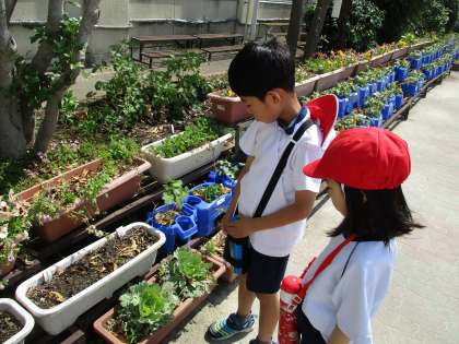 日常生活の時間に、うぐいすの畑に水やりに行きました。すると、モンシロチョウが育てていたキャベツの周りを飛んでいました。「もしかしたら,このキャベツで育ったモンシロチョウがもどって来たのかなあ?」となどと話しながら、じっと見ていました。