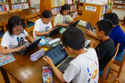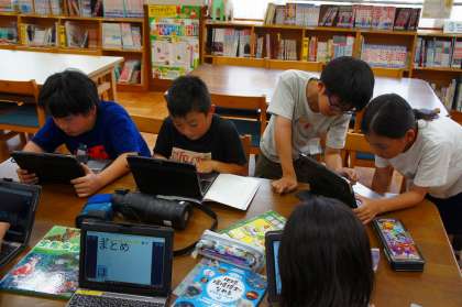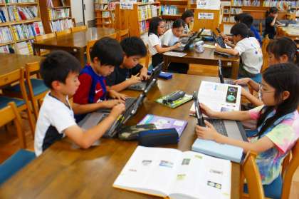 学校図書館で調べ学習をしています。図書とタブレットPC、必要に応じて使い分けていきましょう。必要だと思った資料やテキストは、ロイロノートの共有ノートを活用し、グループの友だちと共有しながら保存していきます。