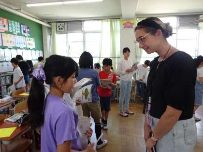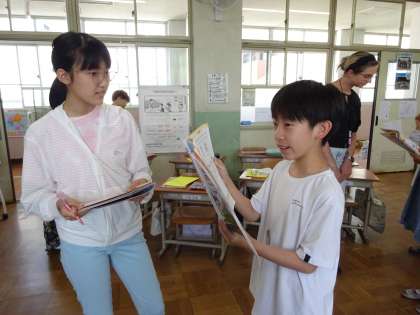 外国語の「Happy birthday」では、誕生日や欲しい物を友だちと伝え合う学習をしています。今回は、誕生日に欲しいものを友達にたずねたり答えたりしました。覚えたての「What do you want for your birthday?」というフレーズを頑張って言ったり、相槌を打ちながら聞いたりするなど、一生懸命伝え合う姿が見られました。