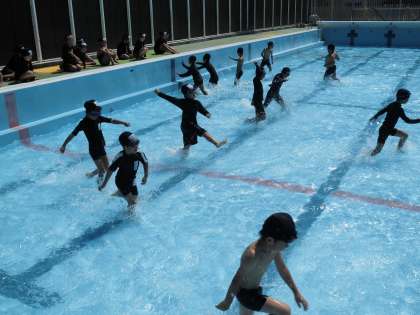 体育科で水慣れの学習が始まりました。今日はお天気も良く暑かったので、みんな笑顔でとっても楽しそうでした。