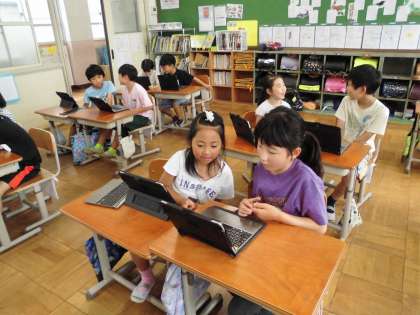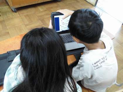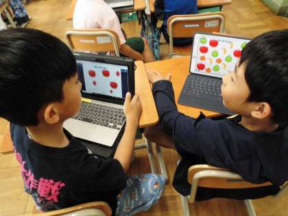 タブレットを使って自分で作ったクイズの画面を見せながら、どの子も積極的にいろいろな友達とクイズを出し合って楽しんでいました。