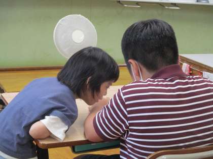 4月から新しい仲間が増えて、早いもので3か月が経ちました。初めは、新しい仲間との学校生活に、どきどきしてお互いに様子を見ていましたが、日が経つにつれて、手をつないで歩いたり、一緒に本を読んだり、お絵かきしている友達をのぞき込んだりするようになってきました。だんだん心の距離が近くなってきました。