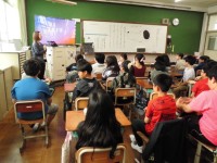 今は、午前11時です。セミナーハウスで震災当時の詳細な体験談を語りべさんにお話していただいています。震災の時の写真を見せてもらいながら子どもたちは、真剣な眼差しでお話しを聞いています。