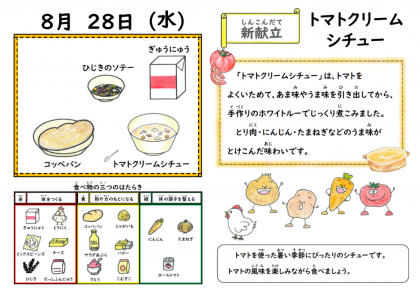 今日の給食は新献立の「トマトのクリームシチュー」でした。