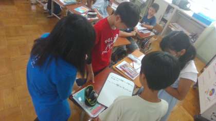 長方形のタイルを、どのようにならべたときに正方形ができるかを調べました。自分たちの考えをグループで交流している様子です。