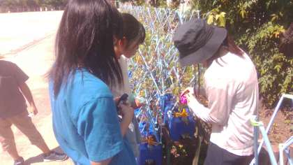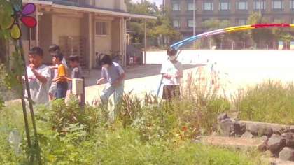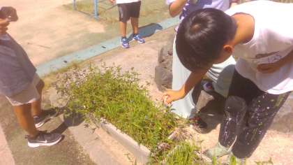 学校に咲いている花々を観察し、花粉を採取しました。蜜を求めてやってくる虫たちにも出合いました。そして、顕微鏡の使い方を確認して、顕微鏡で観察しました。