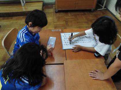 11月に行われる秋の体育学習発表会に向けて、クラスでスローガンについて話し合いました。去年の自分達や上級生の姿、練習の様子を思い出しながら、「みんなで協力」「最後まであきらめない」「楽しめるように」などのキーワードがどのグループからも出てきました。