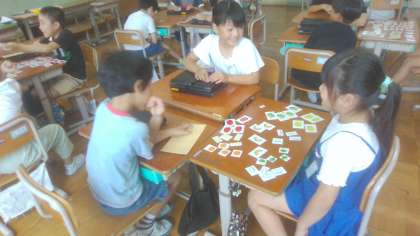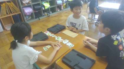 えいごかつどうでは、八百屋さんとお客さんに分かれて、野菜をやり取りしました。
