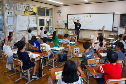 今、4年2組では教育実習生の先生と一緒に学習を進めています。一生懸命な先生に、子どもたちも真剣に応えています。
