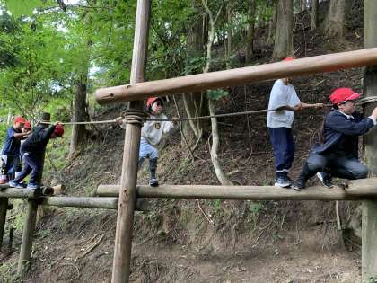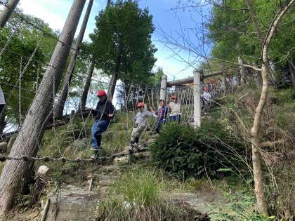 明日の天候が怪しいので、午後のプログラムを一部変更して「冒険の森」でアスレチックを楽しんでいます。