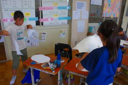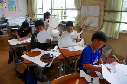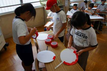 体育科の学習で取り組んでいる「沖縄民謡 エイサー」。11月の体育学習発表会で披露する予定です。その時に手に持って踊る小太鼓「パーランクー」をうちわとペットボトルを使って手作りしました。白い画用紙に赤い縁取りをすると、パーランクーらしくなりました。持って踊るのが楽しみですね。