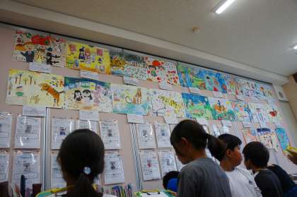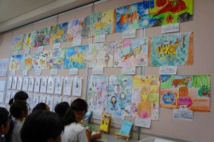 先日完成した「言葉から色・形」の作品。教室の壁面に掲示しています。今日は学年合同で鑑賞会を行い、友だちの作品のよいところを見つけ合いました。
