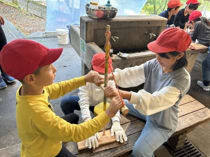 雨に負けず、新しいグループで午前のプログラム、火おこしに挑戦します!