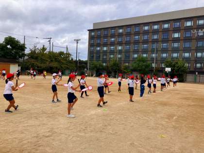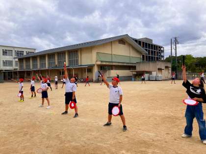 エイサーの踊りを頑張っています!みんなで作った手作りパーランクーを使って踊ってみると、みんなの動きがより大きく見えました。