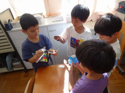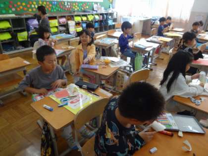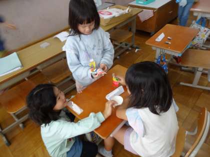 図画工作科で「いっしょにあそぼう ぱくぱっくん」の学習をしました。紙コップに切り込みを入れてまげて、ぱくぱくうごく様子から、つくりたい「ぱくぱっくん」を考えて、ためしながらどんどん飾りをつけていきました。「いかだから、スミをはいているようにしよう!」「歌が大好きな女の子だから、マイクをつけようかな」など、自分だけのぱくぱっくんを楽しみながら作っていました。最後は、ともだちの作品を鑑賞したり、ぱくぱっくんをお散歩させて、みんなで話したり遊んだりしました。とても楽しそうでした。お家でもぜひ話を聞いてみてください。
