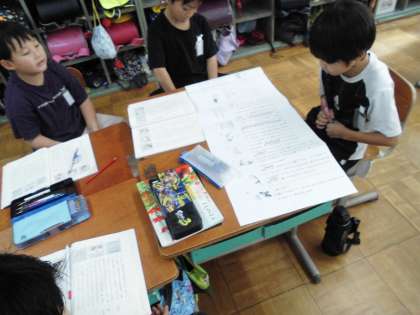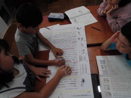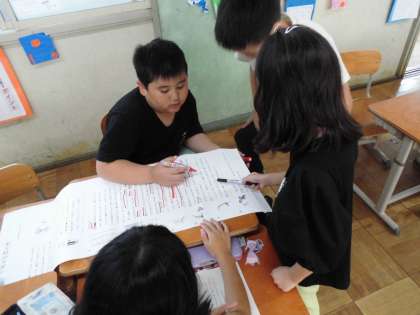 紙コップ花火を作る手順が分かりやすくなる説明の工夫を考えました。「まず・つぎに・さいごに」などの接続語や、材料の大きさや道具を使うときの向き、作る際の注意点など、拡大した教科書のコピーに班の友達と印をつけながら読み直しました。