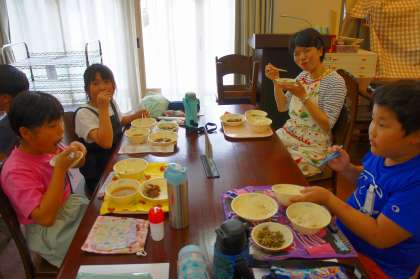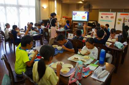 食の学習の後は、ランチルームで給食です。「しば漬ちりめん」は、大根葉とちりめんじゃこの炒め物の中に、細かく刻んだしば漬が入っています。パッと見ただけでは、しば漬が入っているようには思えませんでしたが、食べてみると、しば漬の爽やかな酸味が感じられました。ご飯によく合う、とても美味しい献立でした。