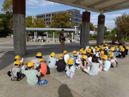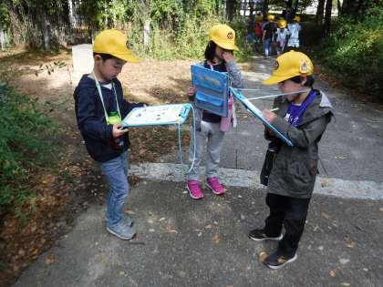 生活科「あきとともだち」の学習で、梅小路公園に秋見つけに行きました。はじめに活動するときの約束を確かめて、秋ビンゴをしにでかけました。「かさかさ音がするもの」や「穴があいているもの」「自分で見つけたとっておきのもの」などを探しました。草むらで耳をすませると、「チチチチチ」という虫の声に気づいたり、芝生が夏は緑だったのに、今はうすい茶色になっていることにきづいてメモをしている姿が見られました。夏と比べると、とてもおもしろかったです。どのグループもはぐれることなく、歩いて回っていて、すばらしいなと思いました。まだまだ「秋」は見つかりそうでしたね!