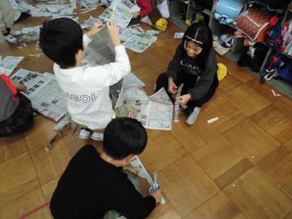 今回は新聞紙を細く長くして、いろいろなところにつないでつるしてみました。