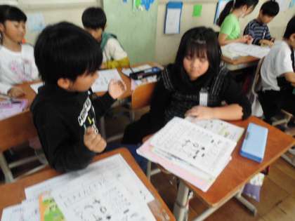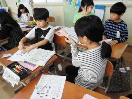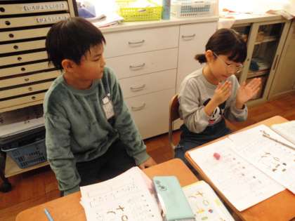音楽科では、リズムを学習しています。今日は「二分音符」を学習し、隣の人とお話しているような2小節のリズムをつくり、お互いに聞きあいました。お手本のリズムだけでなく、自分でリズムを作っている子どももたくさんいました。すごく前向きにがんばっていました。