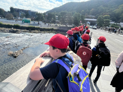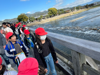 総合的な学習の時間「梅小路の町 もりあげ隊〜嵐山の町の様子を見てみよう〜」のその6です。嵐山で一番有名な観光名所である渡月橋を渡り、子どもたちもその様子に興味津々でした。