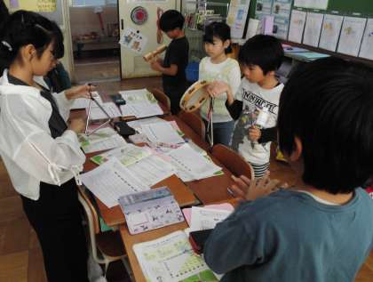 今日は「かぼちゃ」の歌詞に出てくる人がどんどん増えていくことに合わせて、打楽器を増やして合奏をしました。順番や楽器決めを自分たちで話し合って、協力して活動することができました。