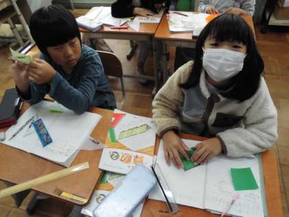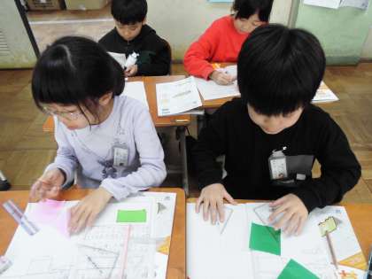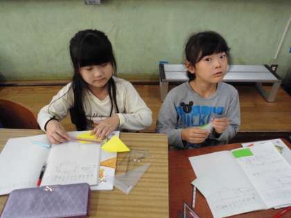 「三角形と四角形」では、実際の紙を折ってその形を作って調べる学習をしました。
